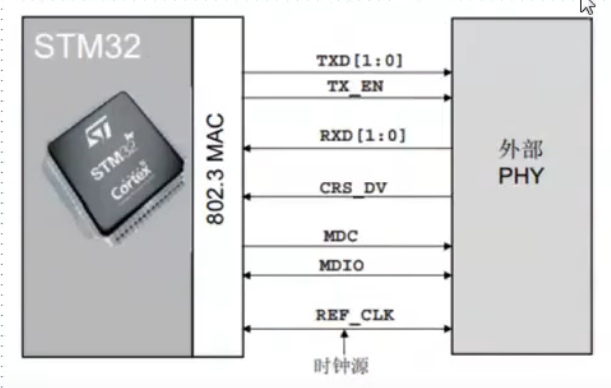 - 接口信号(STM32 与外部 PHY 之间):TXD [1:0]、TX_EN、RXD [1:0]、CRS_DV、MDC、MDIO、REF_CLK(由时钟源提供)。