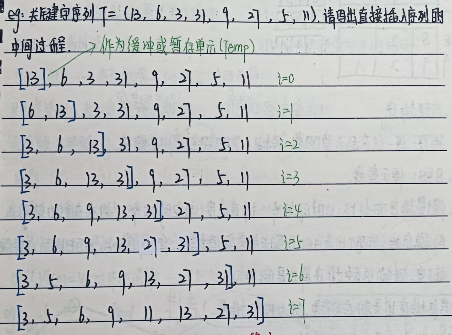 - 逐步插入:从第二个元素开始,依次将每个待插入元素(称为 “关键字”)与已排序序列中的元素从后往前比较,找到其 “在已排序序列中的正确位置” 并插入。