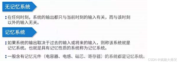 记忆系统,又称为时序逻辑系统。大多数实际的系统都是记忆系统。输出信息,不仅仅与输入有关,还取决于系统当前的状态和条件。