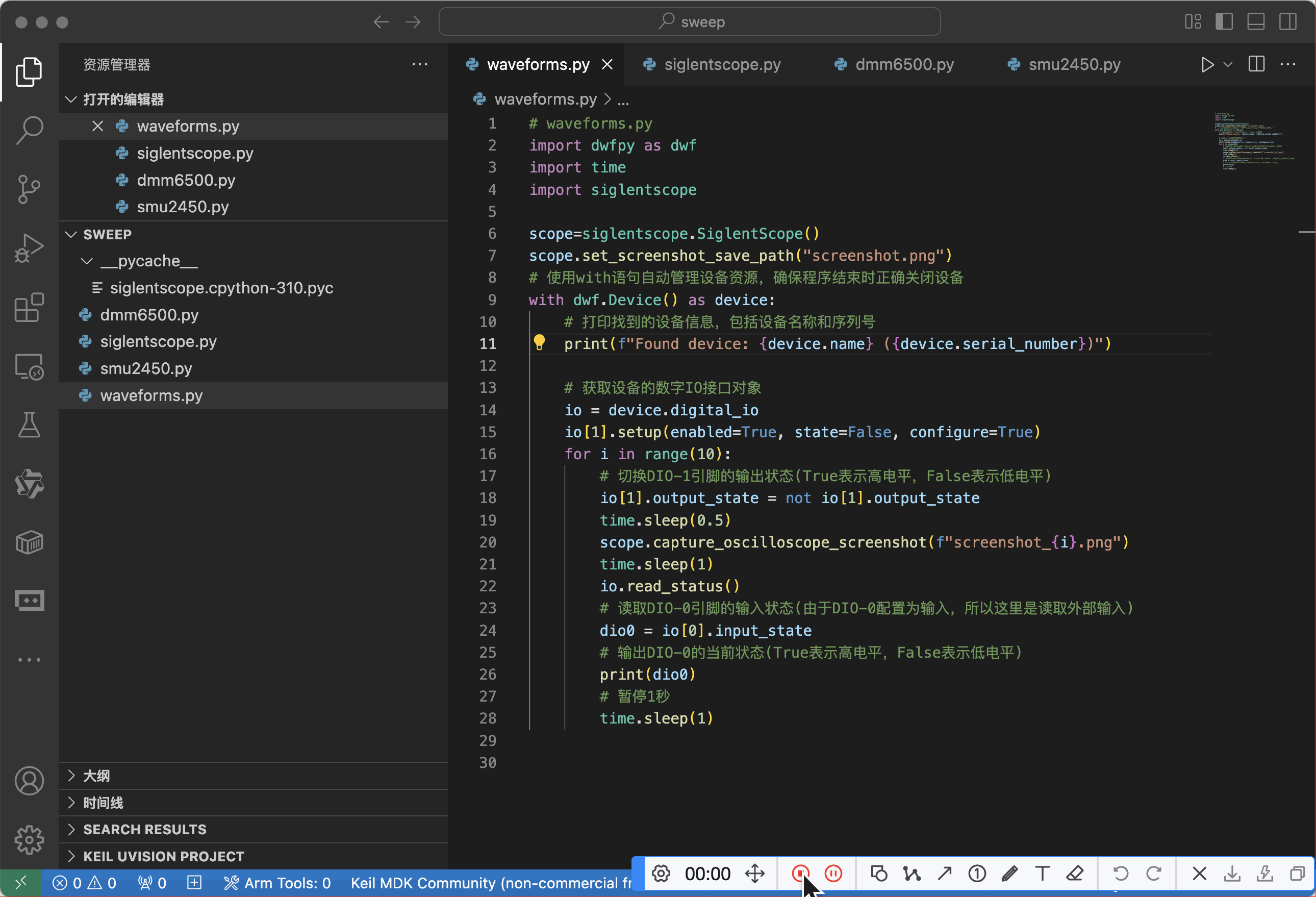 with dwf.Device() as device:# 打印找到的设备信息,包括设备名称和序列号print(f"Found device: {device.name} ({device.serial_number})")# 获取设备的数字IO接口对象io = device.digital_ioio[1].setup(enabled=True, state=False, configure=True)for i in range(10):# 切换DIO-1引脚的输出状态(True表示高电平,False表示低电平)io[1].output_state = not io[1].output_statetime.sleep(0.5)scope.capture_oscilloscope_screenshot(f"screenshot_{i}.png")time.sleep(1)io.read_status()# 读取DIO-0引脚的输入状态(由于DIO-0配置为输入,所以这里是读取外部输入)dio0 = io[0].input_state# 输出DIO-0的当前状态(True表示高电平,False表示低电平)print(dio0)# 暂停1秒time.sleep(1)