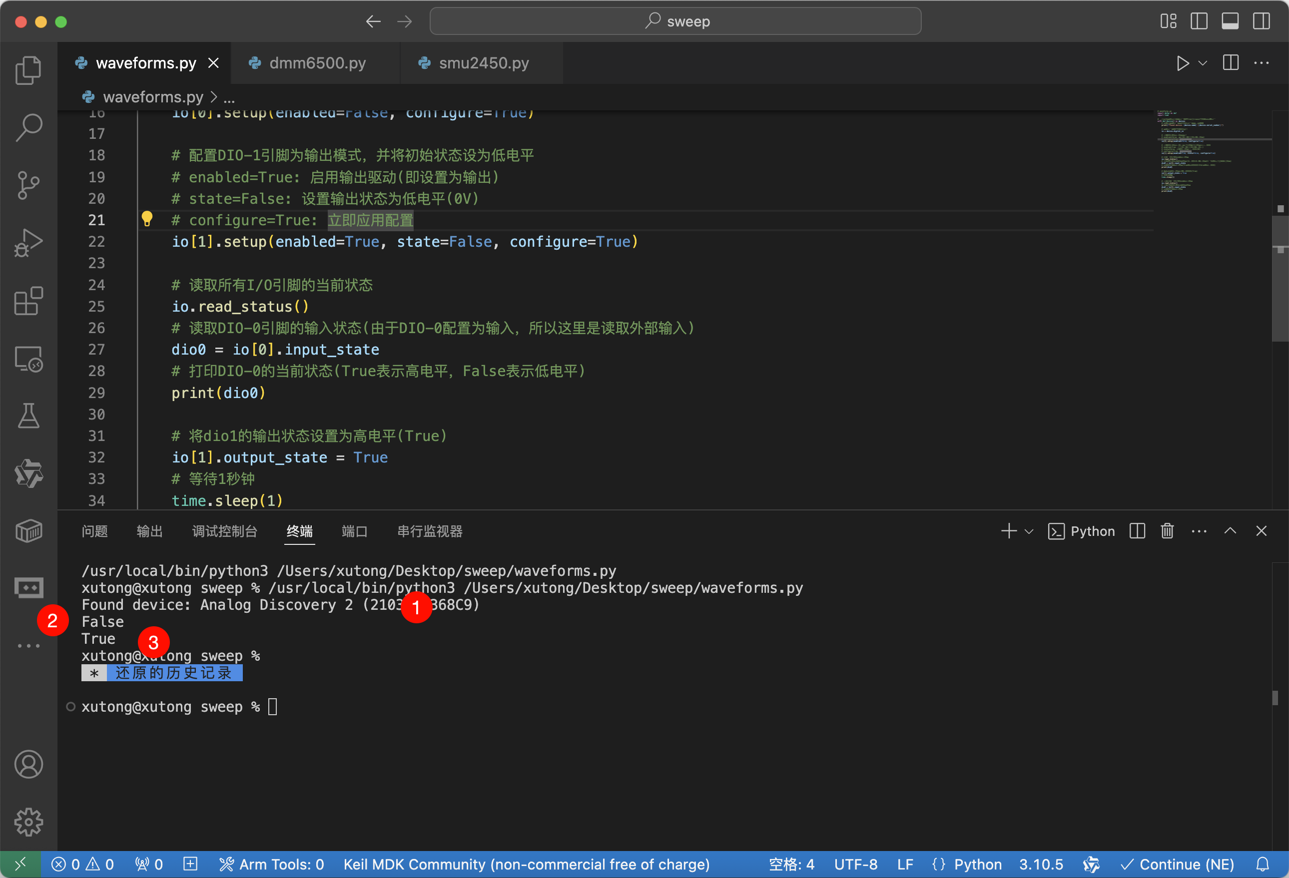 with dwf.Device() as device:# 打印找到的设备信息,包括设备名称和序列号print(f"Found device: {device.name} ({device.serial_number})")# 获取设备的数字IO接口对象io = device.digital_io# 配置DIO-0引脚为输入模式# enabled=False: 禁用输出驱动(即设置为输入)# configure=True: 立即应用配置io[0].setup(enabled=False, configure=True)# 配置DIO-1引脚为输出模式,并将初始状态设为低电平# enabled=True: 启用输出驱动(即设置为输出)# state=False: 设置输出状态为低电平(0V)# configure=True: 立即应用配置io[1].setup(enabled=True, state=False, configure=True)# 读取所有I/O引脚的当前状态io.read_status()# 读取DIO-0引脚的输入状态(由于DIO-0配置为输入,所以这里是读取外部输入)dio0 = io[0].input_state# 打印DIO-0的当前状态(True表示高电平,False表示低电平)print(dio0)# 将dio1的输出状态设置为高电平(True)io[1].output_state = True# 等待1秒钟time.sleep(1)# 再次读取所有I/O引脚的当前状态io.read_status()# 再次读取DIO-0引脚的输入状态dio0 = io[0].input_state# 打印DIO-0的当前状态print(dio0)