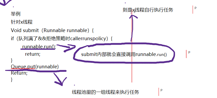 - CallerRunsPolicy:这个策略将任务回退给调用线程,而不会抛出异常。调用线程会尝试执行任务。这个策略可以降低任务提交速度,适合不希望任务丢失且能接受任务执行延迟的场景(让调用submit的线程自行执行任务)