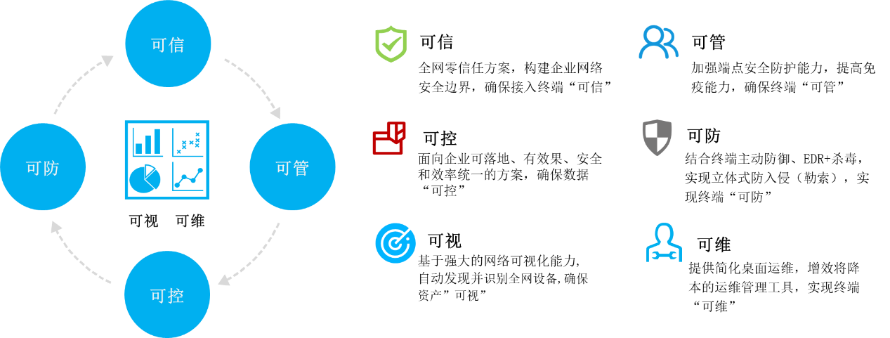 - 终端桌面管控:涵盖终端安全基线完善与加固、终端标准化管理、运维简化管理、软件正版化和标准化管理;