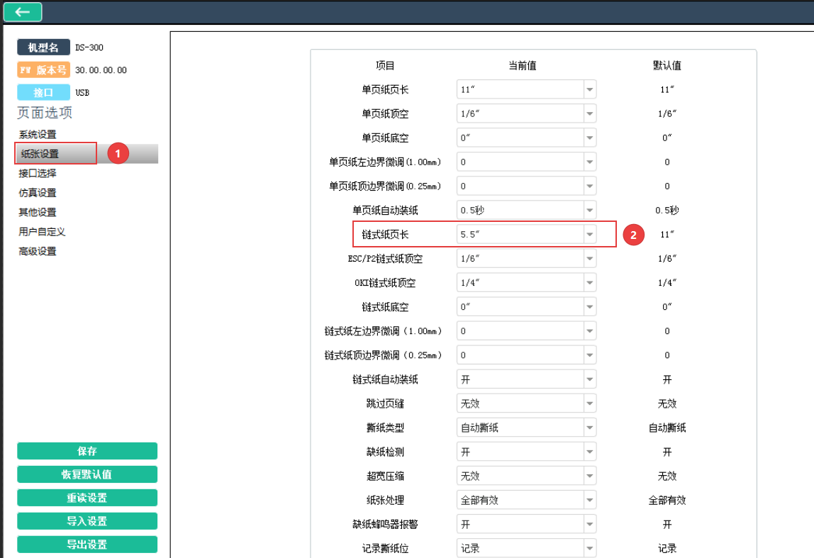5.找到纸张设置,把链式纸页长改为5.5,点保存。