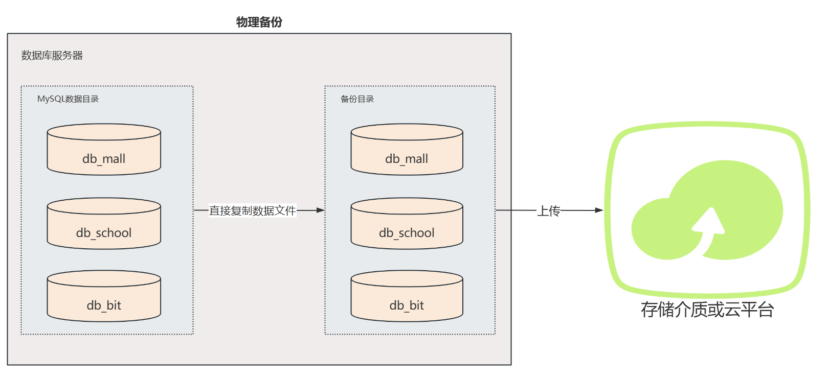 - 物理备份:备份的是 “SQL 执行后的结果文件”,恢复时直接把文件放回原位,数据库启动后就能直接读取,不用再执行 SQL。