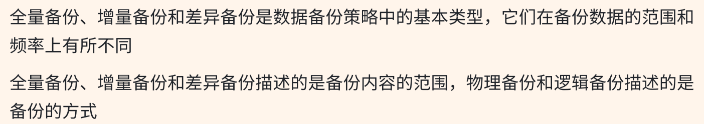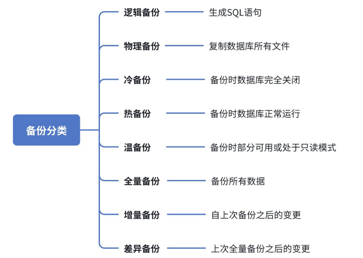 数据库备份主要分为:逻辑备份,物理备份,冷备份,热备份,温备份,全量备份,增量备份,差异备份等
