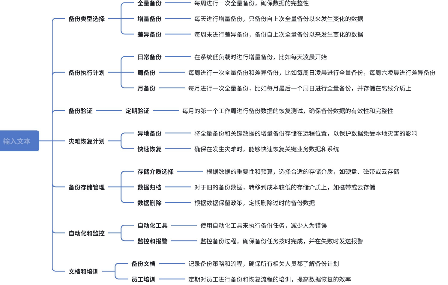 实施备份策略的⽬的是为了确保数据的安全性、完整性和可恢复性,同时满⾜业务需求和合规性要 求。