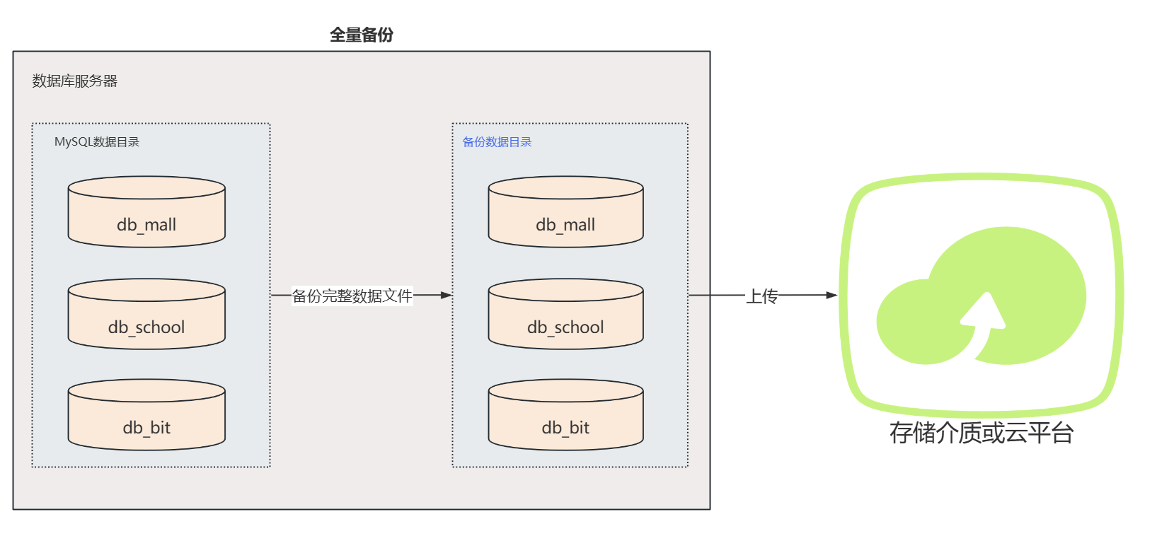 - 定义:全量备份是指备份整个数据库或文件系统的所有数据,包括所有的文件、数据库表、配置文件等。它不依赖于其他备份,可以独立恢复数据。