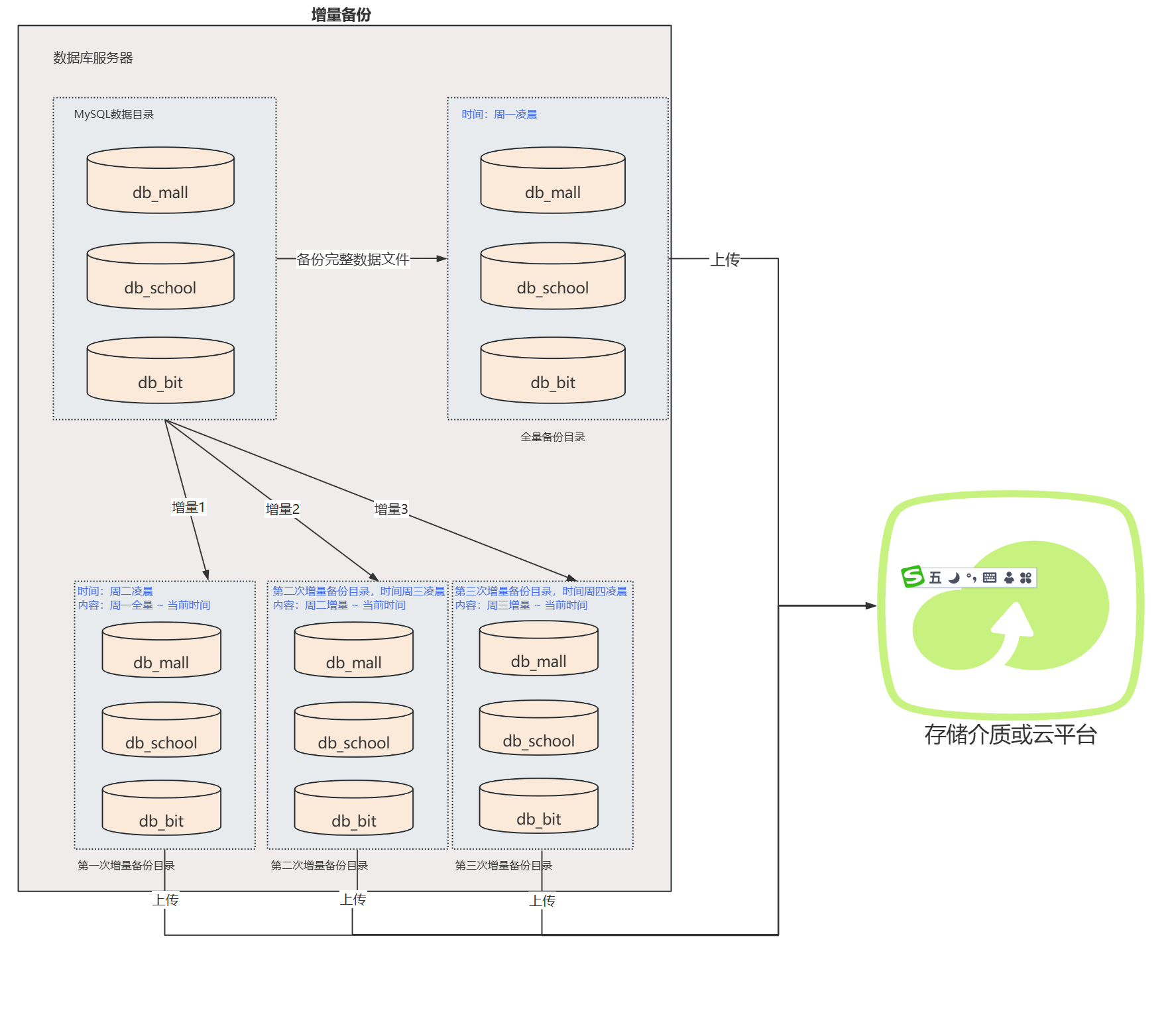 - 定义:增量备份是指只备份自上次备份以来发生变化的数据。可以是上次全量备份以后,也可以是上次增量备份以后。