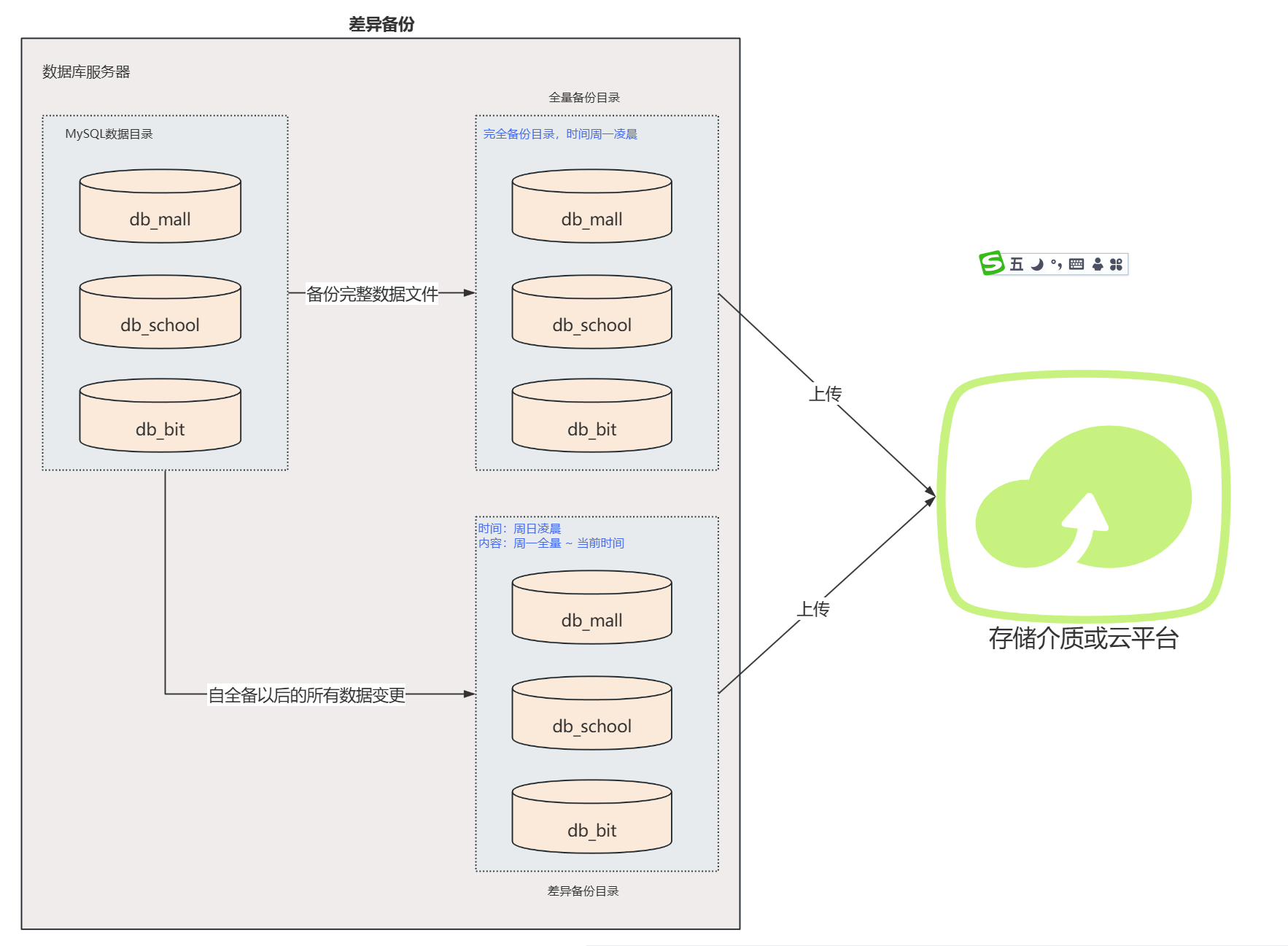 - 定义:差异备份是指只备份自上次全量备份以来所有变化的数据。