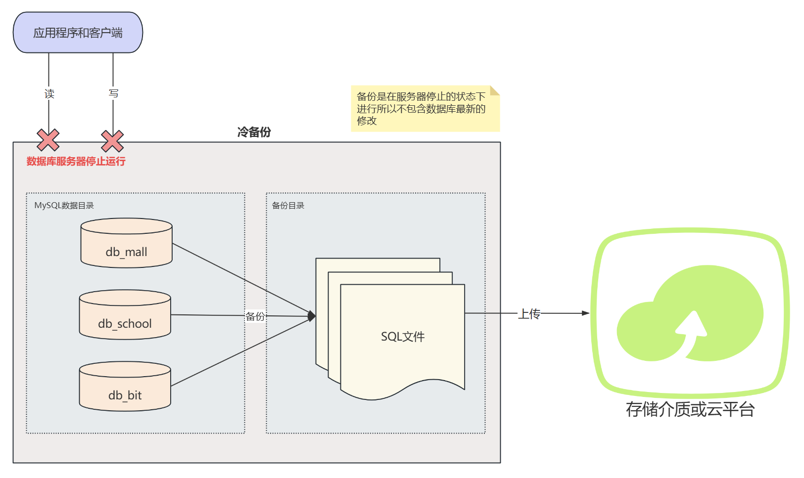 - 定义:冷备份是指在数据库完全关闭的情况下进行的备份。在备份过程中,数据库服务不可用。