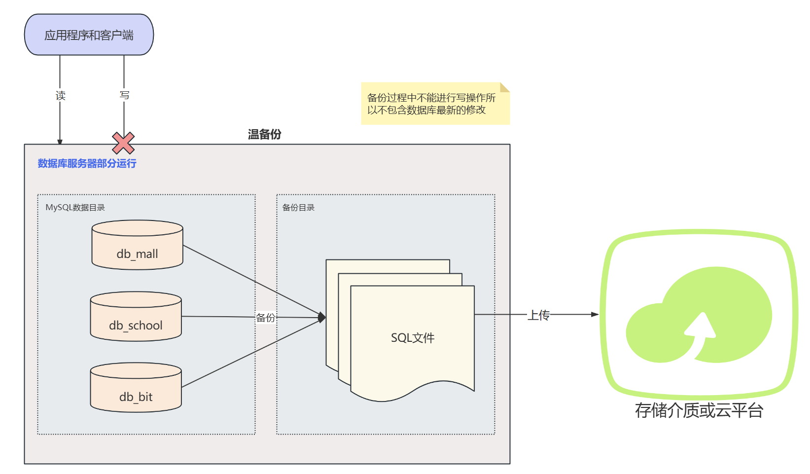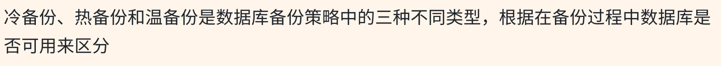 - 定义:温备份是介于冷备份和热备份之间的一种备份方式,数据库在备份过程中部分可用或处于只读模式。