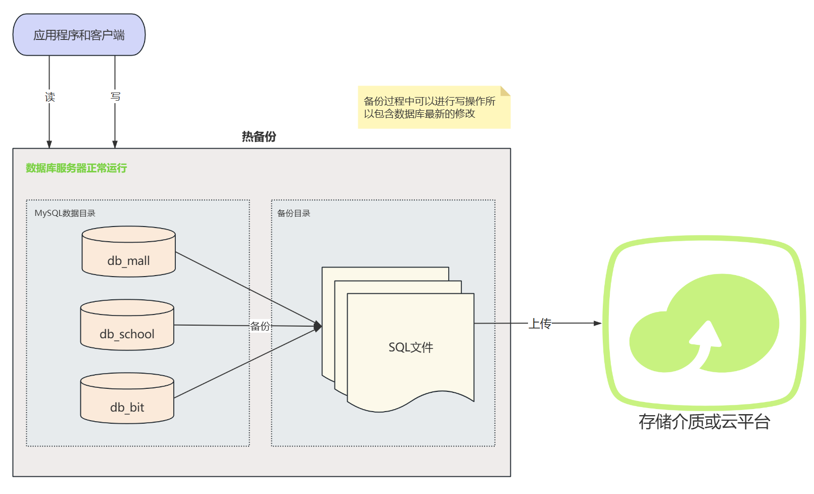 - 定义:热备份是指在数据库正常运行的情况下进行的备份,备份过程中数据库服务仍然可用。