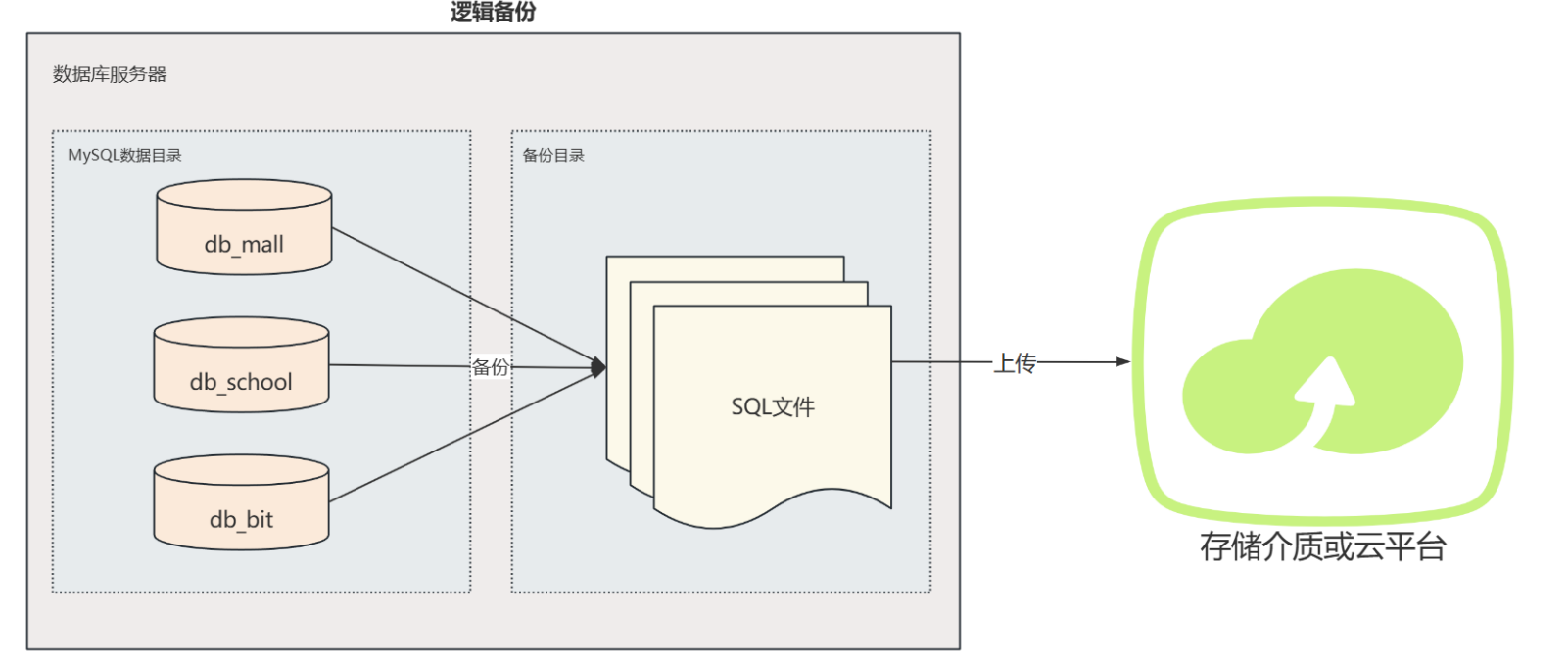 - 定义:逻辑备份指的是备份数据库的逻辑结构和数据,通常是通过导出数据库中的数据和对象(如表结构、视图、存储过程等)来实现的。生成的是数据库可以识别的格式,如 SQL 语句。