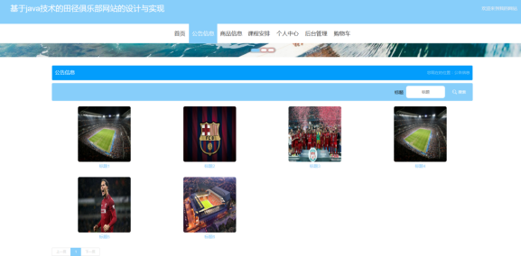 用户可以在公告信息页面查看最新发布的公告,了解俱乐部的动态和活动。页面上列出了多个公告标题,用户可以通过搜索功能快速找到感兴趣的公告。公告标题如“标题1”、“标题2”等显示在页面上,学员可以查看详情或翻阅历史公告。分页功能(上一页、下一页)使得用户能够便捷地浏览所有公告。系统的设计简洁明了,确保了学员和管理员能够高效访问和管理信息,提升了整体使用体验。如图5-2所示。