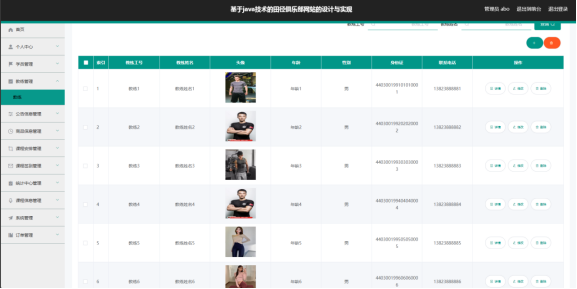 在管理员功能的教练管理页面,管理员可以查看教练的基本信息,包括教练工号、姓名、年龄、性别、身份证号码、联系电话等。每个教练的资料旁边有“详情”、“修改”和“删除”操作,管理员可以管理教练信息。页面提供了简洁的操作界面,便于管理员有效地进行教练资料的查看和更新。如图5-12所示。