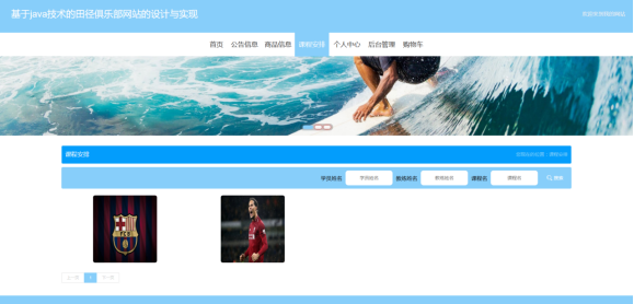 在课程安排页面,用户可以查看和搜索课程信息,包括学员姓名、教练姓名和课程名称。页面提供了分页功能(上一页、下一页),便于浏览不同的课程安排。搜索功能帮助用户快速找到特定的课程,提升了使用便捷性。如图5-4所示。
