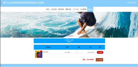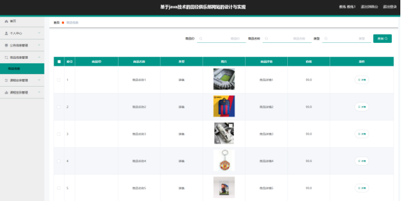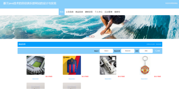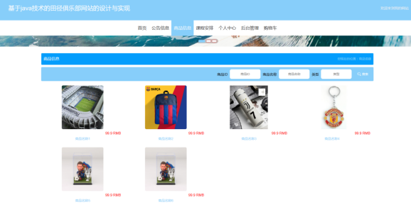 田径俱乐部网站提供了简洁明了的用户界面,旨在为学员和管理者提供便捷的服务。网站的首页包含了公告信息、商品信息、课程安排、个人中心、后台管理和购物车等功能模块,方便用户快速浏览和操作。学员可以在商品信息页面查看俱乐部出售的各类商品,包括运动服装、器材等,每个商品展示了商品ID、名称、类型以及价格。页面支持商品搜索功能,学员可以根据需要快速找到相关商品。此外,网站还展示了多个商品的例子,如“BARCA”和“UNITE”等,价格信息也清晰标示,帮助学员做出购物决策。在购物车模块,学员可以将商品加入购物车,并进行订单管理和结算。整个系统的设计确保了用户能够方便地进行商品浏览、购买操作和个人信息管理,从而提升了俱乐部服务的效率与体验。如图5-1所示。