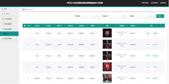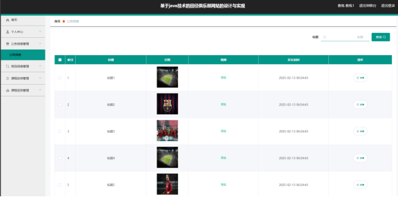 公告信息管理页面列出了所有公告的标题、封面、视频和发布时间,教练可以方便地进行预览和管理。每个公告旁边都有“预览”和“详情”按钮,教练可以查看公告的详细内容。页面设计简洁,支持公告信息的查看与操作,确保教练能高效发布和管理俱乐部的通知和活动。如图5-7所示。