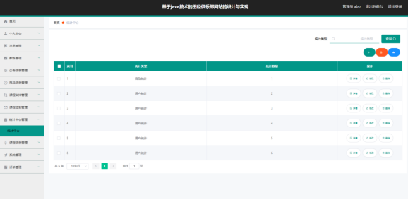 管理员可以在统计中心管理中查看不同的统计类型,如商品统计和用户统计。每项统计显示统计数量,且提供操作选项,包括查看详情、修改和删除。管理员可以轻松管理数据,支持分页浏览,便于处理多条统计信息。如图5-14所示。
