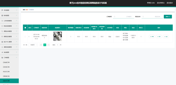 管理员可以查看和管理订单信息,包括订单编号、商品名称、商品图片、购买数量、价格、折扣、支付类型、订单状态和收货人信息。还可以对订单进行修改、发货等操作,支持查看不同状态的订单,如已支付、未支付、已发货等,方便订单管理和跟踪。如图5-15所示。
