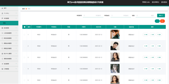 在管理员功能的学员管理页面,管理员可以查看学员的基本信息,包括学员账号、姓名、性别、手机号、出生年月、家庭住址和头像等。每个学员的资料旁边有“修改”、“详情”和“删除”操作,管理员可以进行相应的管理操作。页面简洁明了,支持学员信息的快速查看和更新,方便管理员有效管理学员资料。如图5-11所示。