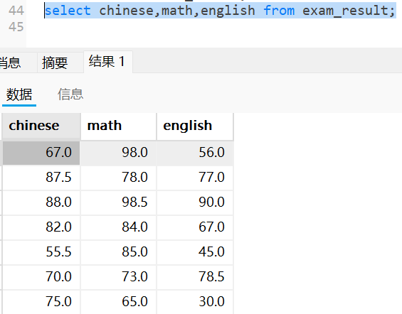 create table exam_result (id int,name varchar(20),chinese decimal(3,1),math decimal(3,1)
