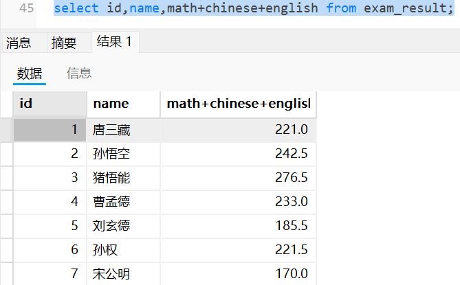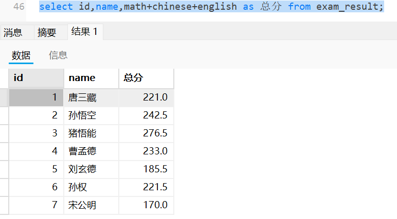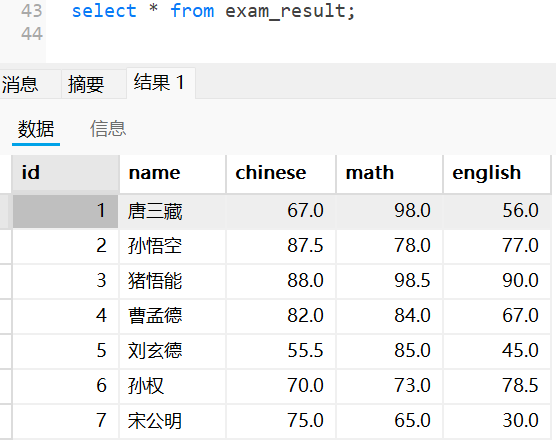 (1,'唐三藏', 67, 98, 56),(2,'孙悟空', 87.5, 78, 77),(3,'猪悟能', 88, 98.5, 90),(4,'曹孟德', 82, 84, 67),(5,'刘玄德', 55.5, 85, 45),(6,'孙权', 70, 73, 78.5),(7,'宋公明', 75, 65, 30);