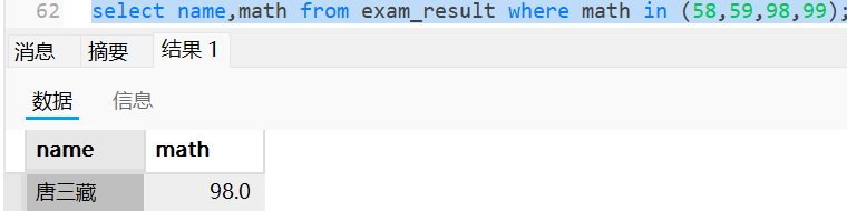 -- 查询数学成绩是 58 或者 59 或者 98 或者 99 分的同学及数学成绩