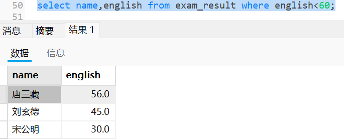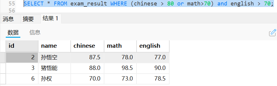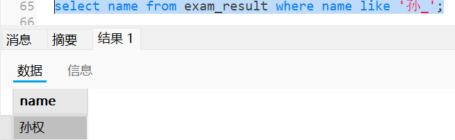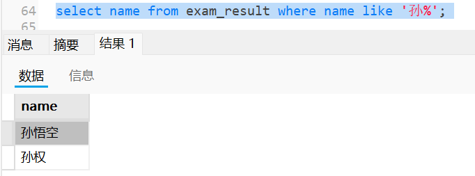 SELECT name FROM exam_result WHERE name LIKE '孙%';-- 匹配到孙悟空、孙权