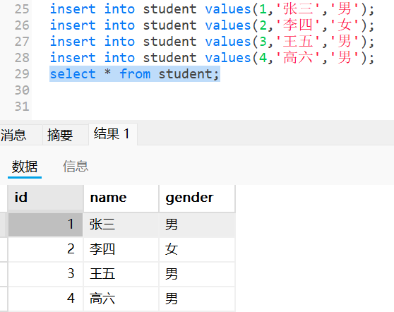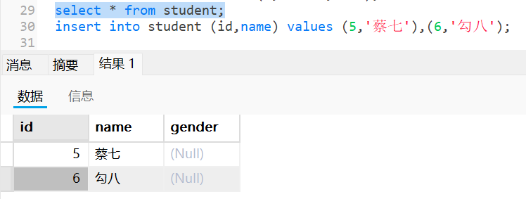 insert into student (id,name) values (5,'蔡七'),(6,'勾八');