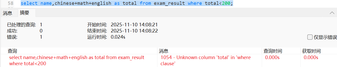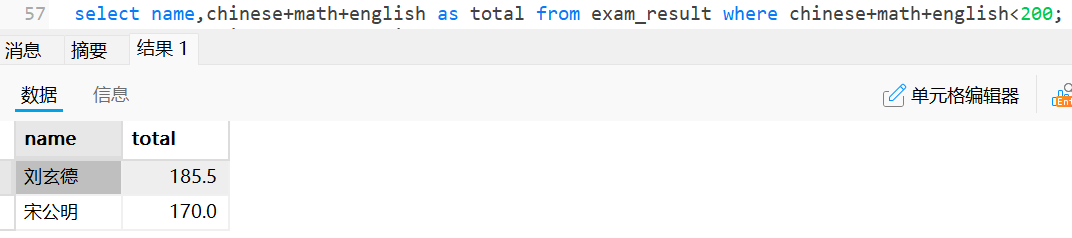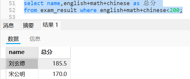 注意:1. WHERE条件可以使用表达式,但不能使用别名;