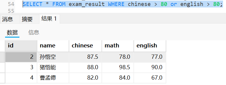 b.查询语文成绩大于80分,或英语成绩大于80分的同学: