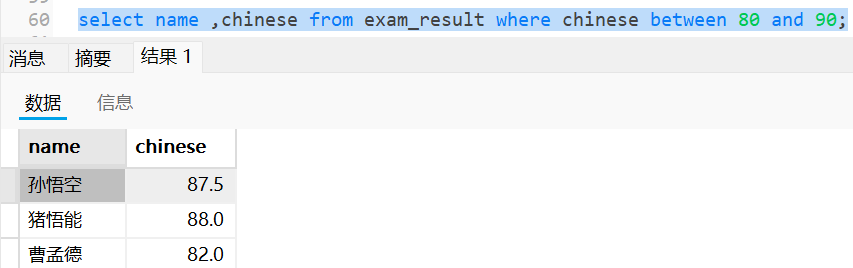 -- 查询语文成绩在 [80, 90] 分的同学及语文成绩