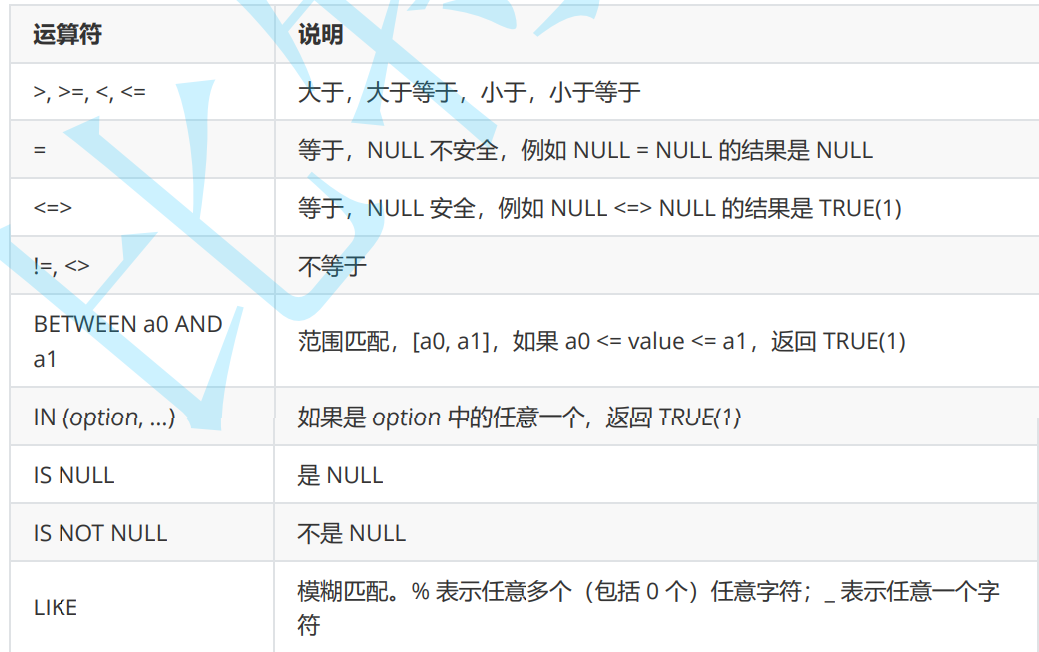 注意:1>.<=>和=唯一区别是判断null与null时,<=>的结果为true;