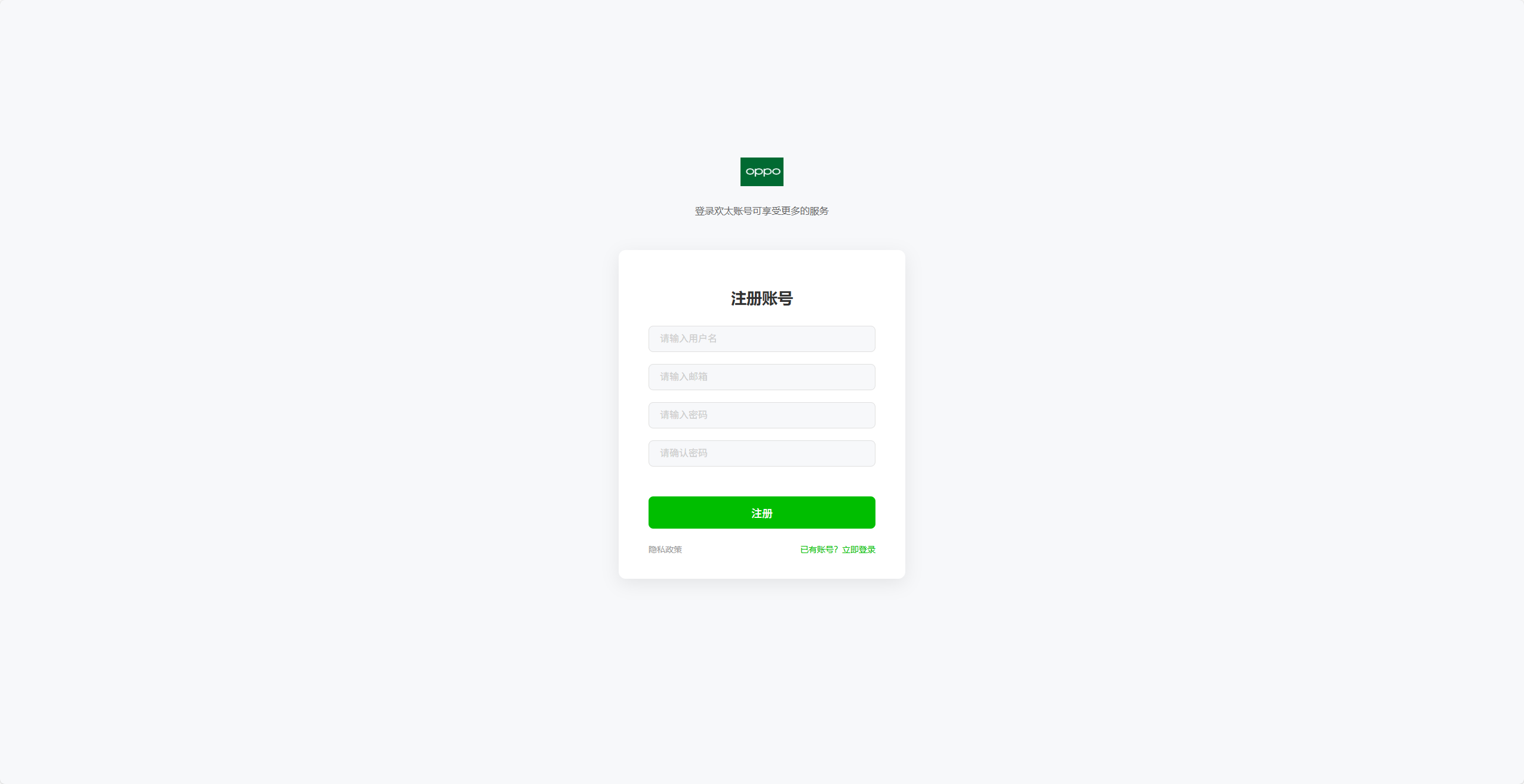 <body><div class="auth-page-container"><div class="auth-header"><a href="index.html" class="logo"><img src="images/0.png" alt="OPPO Logo"></a><p class="tagline">登录欢太账号可享受更多的服务</p></div><div class="auth-form-card"><h2>注册账号</h2><form class="auth-form"><div class="form-group"><input type="text" id="username" name="username" placeholder="请输入用户名" required></div><div class="form-group"><input type="email" id="email" name="email" placeholder="请输入邮箱" required></div><div class="form-group"><input type="password" id="password" name="password" placeholder="请输入密码" required></div><div class="form-group"><input type="password" id="confirm-password" name="confirm-password" placeholder="请确认密码" required></div><button type="submit" class="submit-btn green-btn">注册</button></form><div class="auth-links"><a href="#" class="privacy-link">隐私政策</a><a href="login.html" class="register-link">已有账号?立即登录</a></div></div></div><script src="script.js"></script>