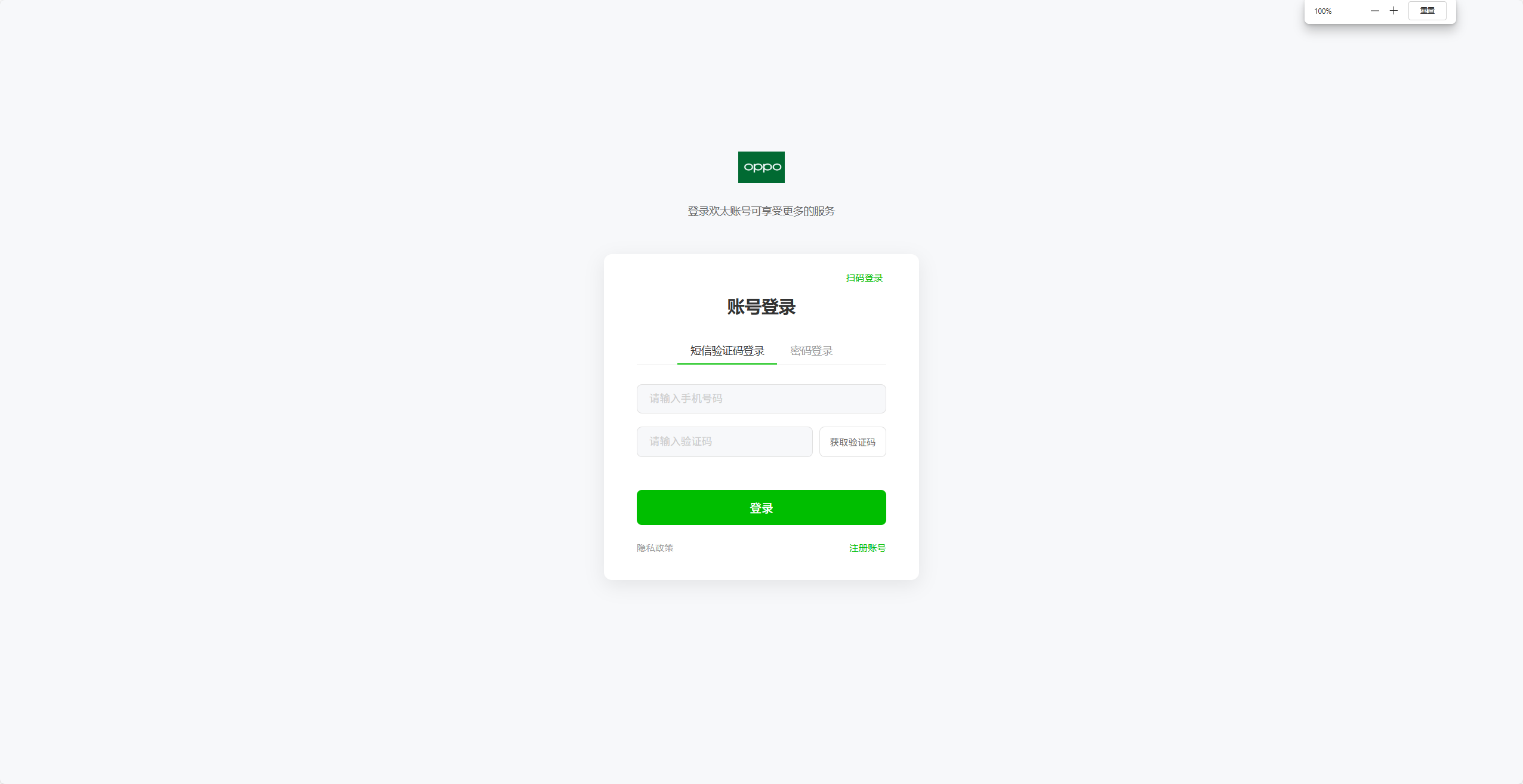 <body><div class="auth-page-container"><div class="auth-header"><a href="index.html" class="logo"><img src="images/0.png" alt="OPPO Logo"></a><p class="tagline">登录欢太账号可享受更多的服务</p></div><div class="auth-form-card"><div class="scan-login-toggle"><a href="#">扫码登录</a><span class="qr-icon"></span></div><h2>账号登录</h2><div class="login-tabs"><span class="tab-item active" data-target="sms-login">短信验证码登录</span><span class="tab-item" data-target="password-login">密码登录</span></div><form class="auth-form" id="sms-login"><div class="form-group"><input type="text" id="sms-phone" name="sms-phone" placeholder="请输入手机号码" required></div><div class="form-group verification-group"><input type="text" id="sms-code" name="sms-code" placeholder="请输入验证码" required><button type="button" class="get-code-btn">获取验证码</button></div><button type="submit" class="submit-btn green-btn">登录</button></form><form class="auth-form hidden" id="password-login"><div class="form-group"><input type="text" id="username" name="username" placeholder="用户名/邮箱" required></div><div class="form-group"><input type="password" id="password" name="password" placeholder="密码" required></div><button type="submit" class="submit-btn green-btn">登录</button></form><div class="auth-links"><a href="#" class="privacy-link">隐私政策</a><a href="register.html" class="register-link">注册账号</a></div></div></div><script src="script.js"></script>