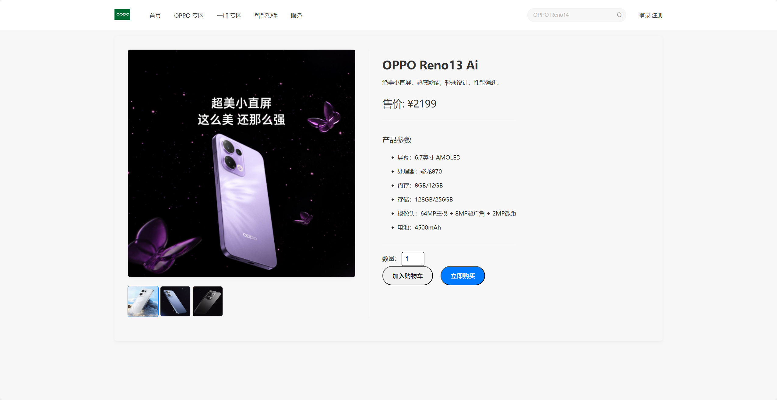 <body><header class="header"><div class="container"><div class="logo"><img src="images/0.png" alt="OPPO Logo"></div><nav class="main-nav"><ul><li><a href="index.html">首页</a></li><li><a href="#">OPPO 专区</a></li><li><a href="#">一加 专区</a></li><li><a href="#">智能硬件</a></li><li><a href="#">服务</a></li></ul></nav><div class="search-bar"><input type="text" placeholder="OPPO Reno14"><button type="button">Q</button></div><div class="user-actions"><a href="login.html">登录</a> | <a href="register.html">注册</a></div></div></header><main class="main-content"><div class="container product-detail-container"><div class="product-images"><img src="images/11.png" alt="OPPO Reno13 Ai" class="main-image"><div class="thumbnail-images"><img src="images/20.png" alt="Thumbnail 1"><img src="images/21.png" alt="Thumbnail 2"><img src="images/22.png" alt="Thumbnail 3"></div></div><div class="product-info"><h1>OPPO Reno13 Ai</h1><p class="product-description">绝美小直屏,超感影像,轻薄设计,性能强劲。</p><p class="product-price">售价: ¥<span class="price-value">2199</span></p><div class="product-specs"><h3>产品参数</h3><ul><li>屏幕:6.7英寸 AMOLED</li><li>处理器:骁龙870</li><li>内存:8GB/12GB</li><li>存储:128GB/256GB</li><li>摄像头:64MP主摄 + 8MP超广角 + 2MP微距</li><li>电池:4500mAh</li></ul></div><div class="product-actions"><div class="quantity-selector"><label for="quantity">数量:</label><input type="number" id="quantity" value="1" min="1"></div><button class="add-to-cart-btn">加入购物车</button><button class="buy-now-btn">立即购买</button></div></div></div></main><script src="script.js"></script>