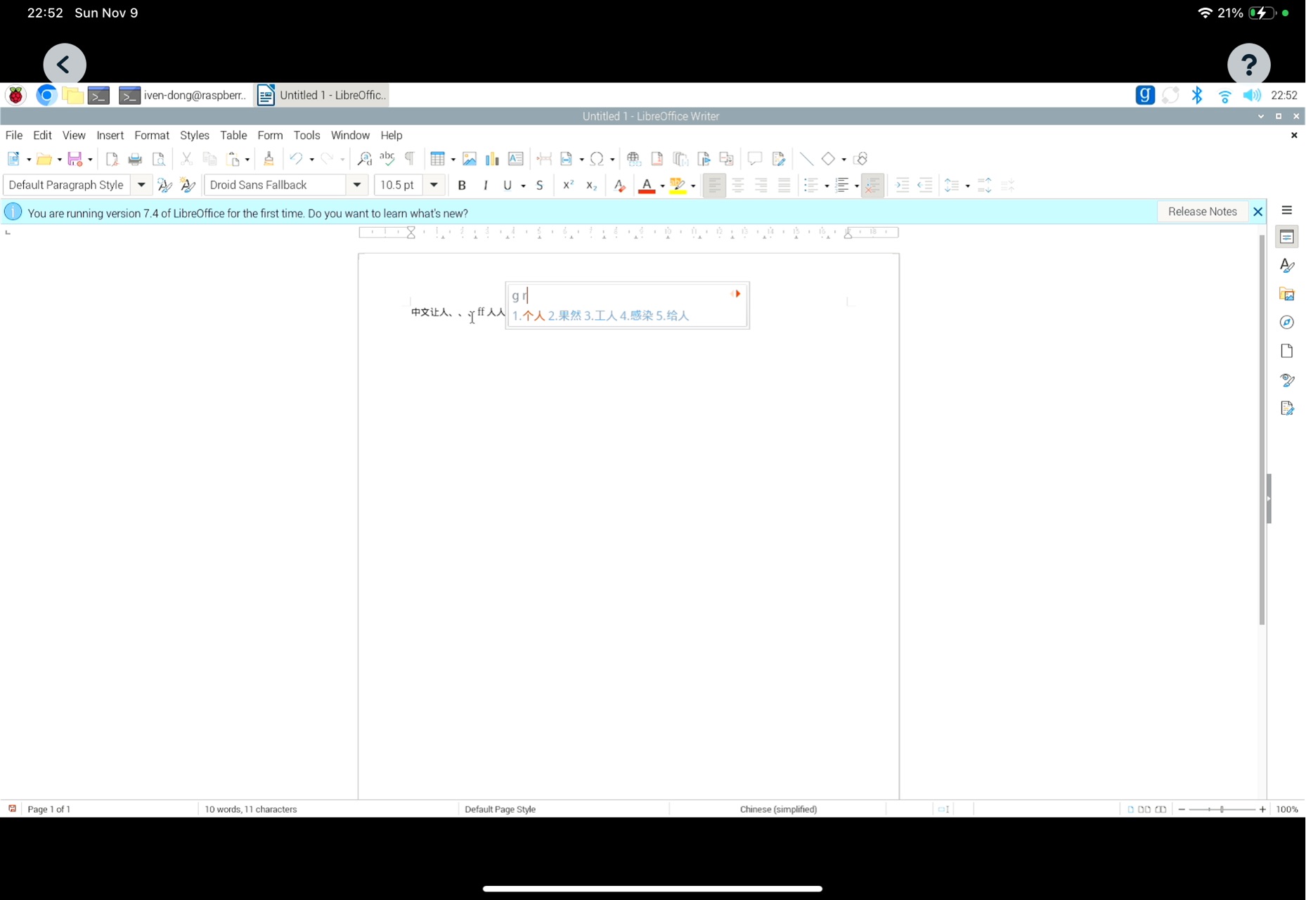 重启后,打开LibreOffice Writer,选择中文输入法,此时可以通过拼音输入汉字了!