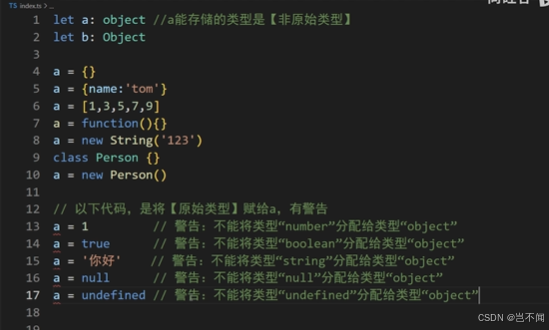 类型推断:ts根据代码,进行类型推断,也就是声明啥类型,就只能存储对应的类型