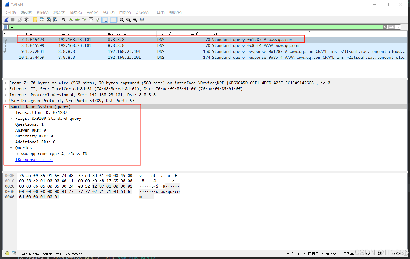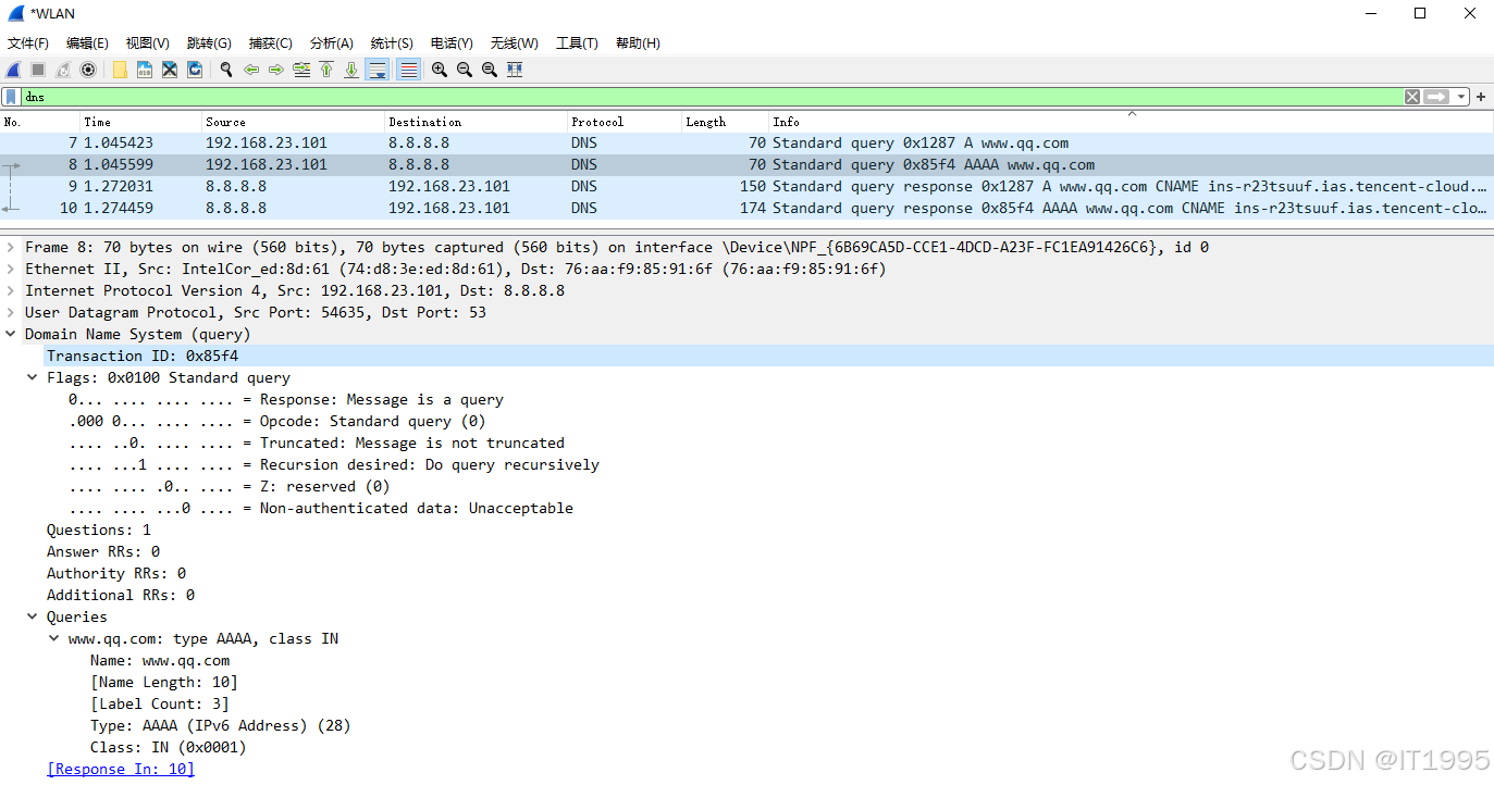 ① 访问DNS的服务器为8.8.8.8,端口为53(DNS的默认端口在标准场景下是53)