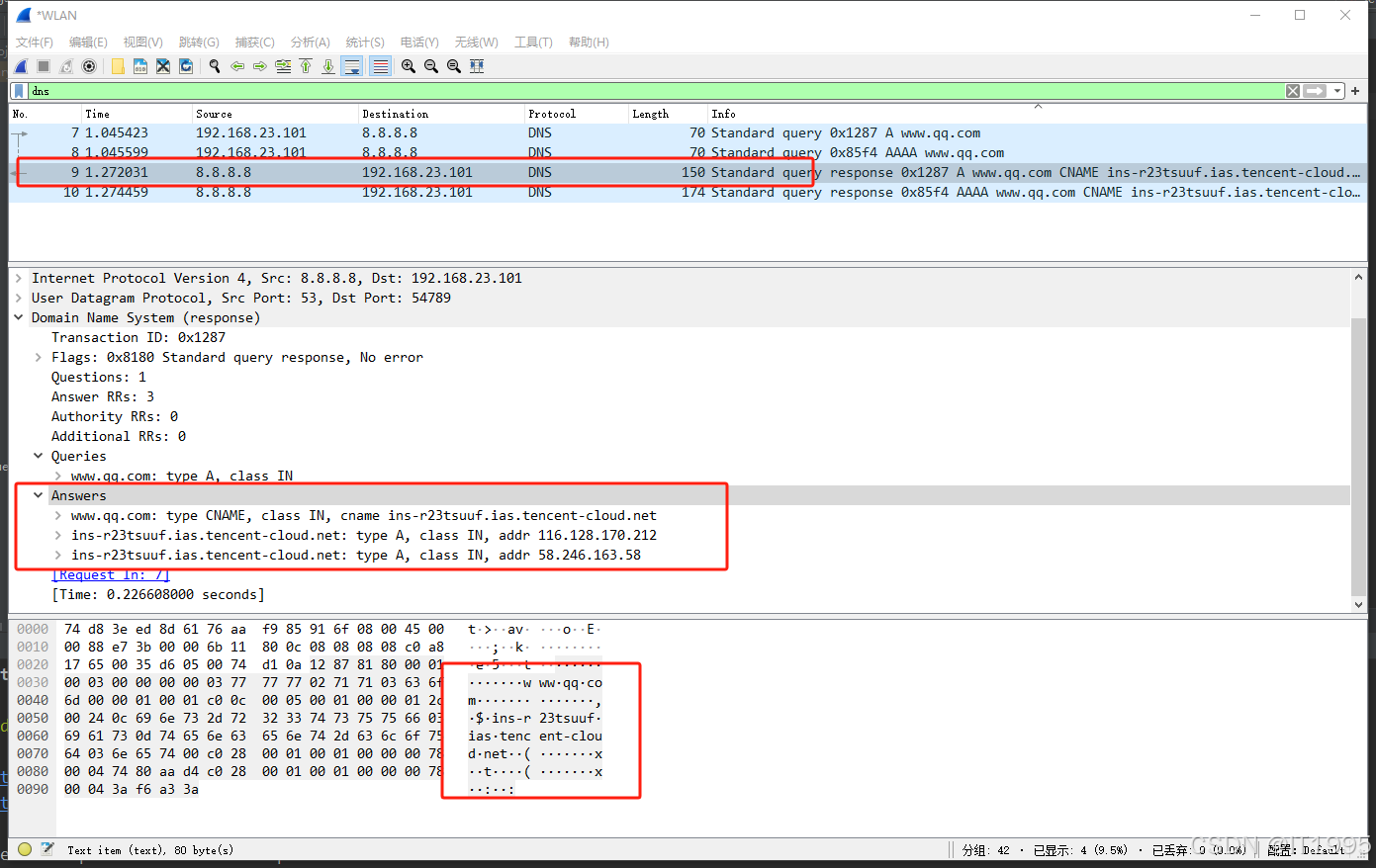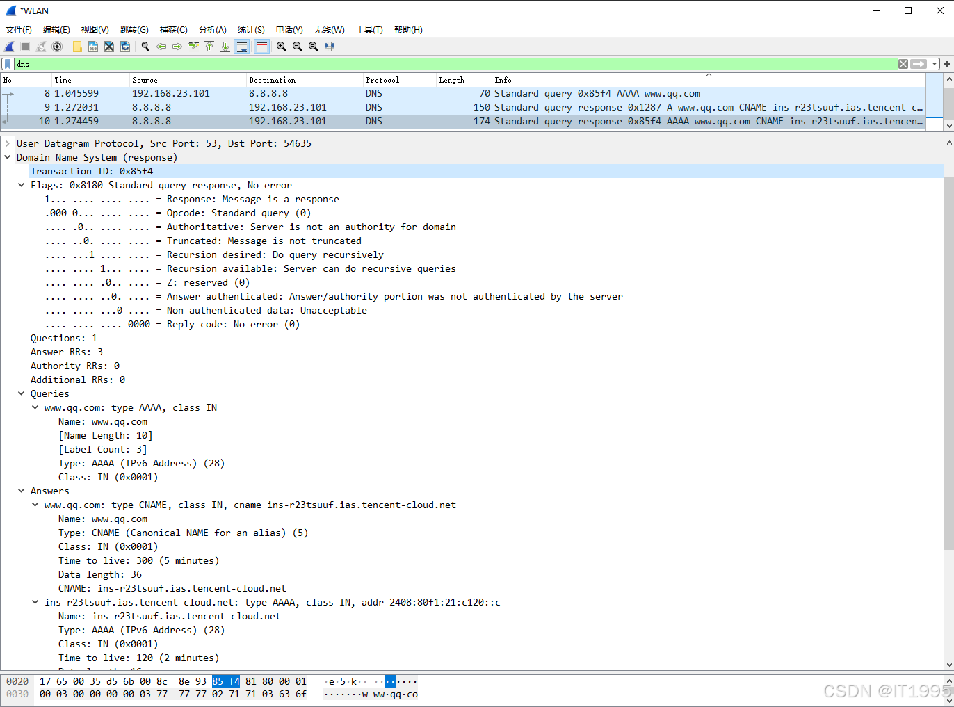 ③ 问题数:1(与请求一致),回答数:3(含 1 条 CNAME + 2 条 A 记录,与后面的3条能对应起来)。