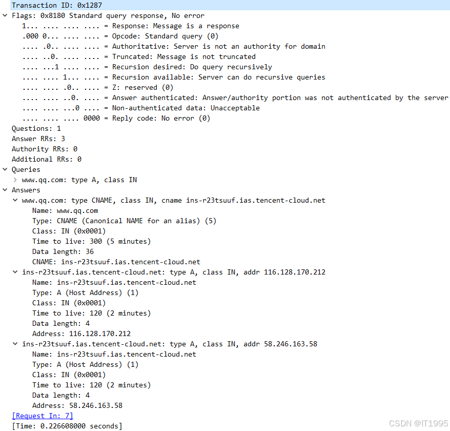 ② 标志位:QR=1(响应)、AA=1(权威应答,服务器是域名的权威源)、RCODE=0(解析成功)。