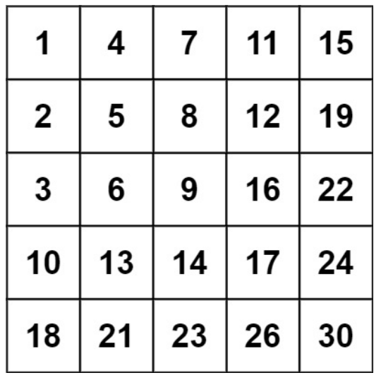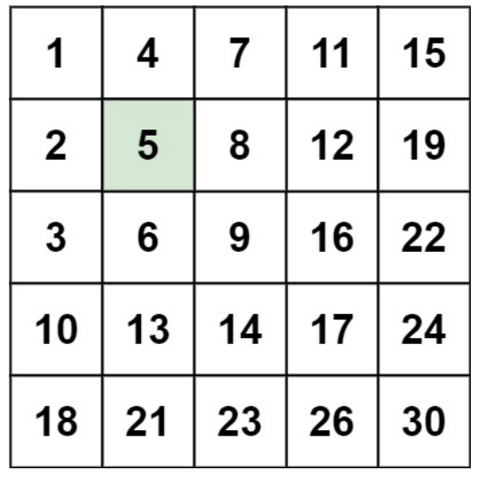 输入:matrix = [[1,4,7,11,15],[2,5,8,12,19],[3,6,9,16,22],[10,13,14,17,24],[18,21,23,26,30]]