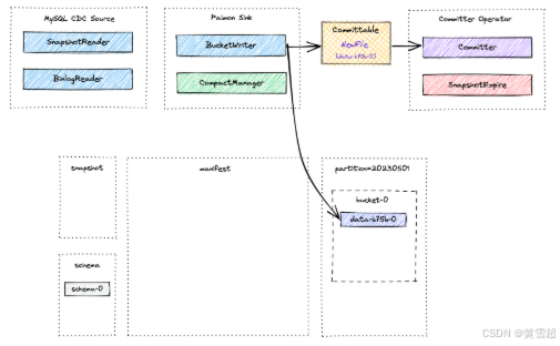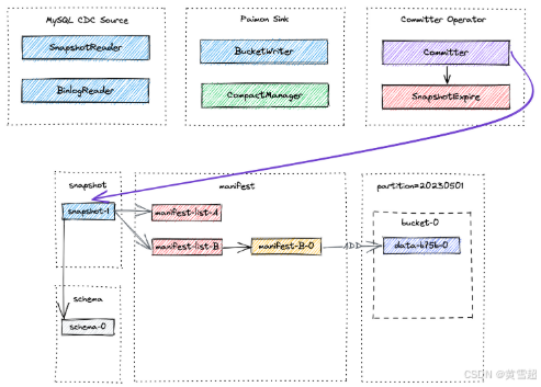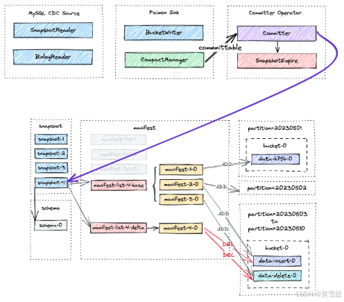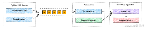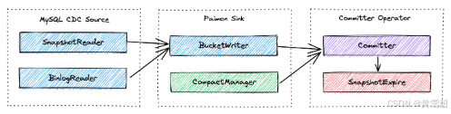 SnapshotReader读取快照数据,BinlogReader分别读取增量数据。Paimon Sink在桶级别将数据写入Paimon表。其中的