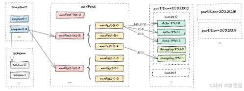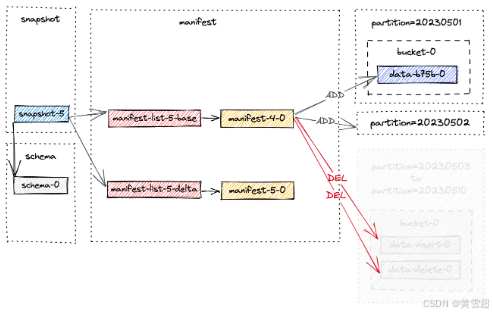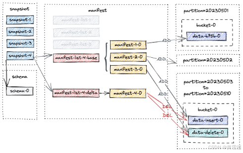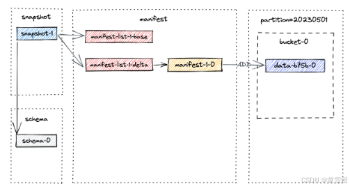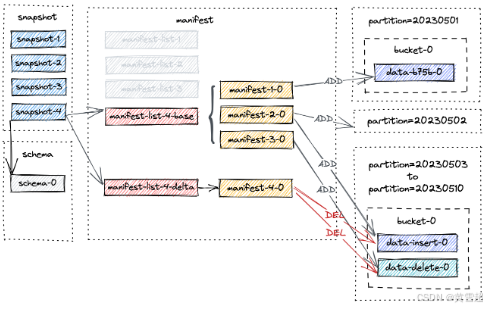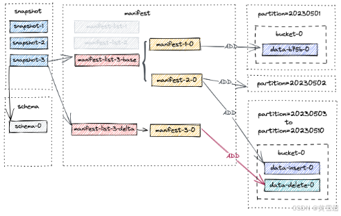 % ls -1tR. ./T: dt = 20230501 dt = 20230502 dt = 20230503 dt = 20230504 dt = 20230505 dt = 20230506 dt = 20230507 dt = 20230508 dt = 20230509 dt = 20230510 snapshot schema manifest./T/snapshot: LATEST snapshot-2 EARLIEST snapshot-1./T/manifest: manifest-list-9ac2-5e79-4978-a3bc-86c25f1a303f-1 # snapshot-2的增量清单列表 manifest-list-9ac2-5e79-4978-a3bc-86c25f1a303f-0 # snapshot-2的基础清单列表 manifest-f1267033-e246-4470-a54c-5c27fdbdd074-0 # snapshot-2的清单文件manifest-list-4ccc-c07f-4090-958c-cfe3ce3889e5-1 # snapshot-1的增量清单列表 manifest-list-4ccc-c07f-4090-958c-cfe3ce3889e5-0 # snapshot-1的基础清单列表 manifest-2b833ea4-d7dc-4de0-ae0d-ad76eced75cc-0 # snapshot-1的清单文件./T/dt = 20230501/bucket-0: data-b75b7381-7c8b-430f-b7e5-a204cb65843c-0.orc... # 每个分区都有写入bucket-0的数据 ..../T/schema: schema-0