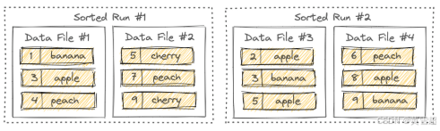 LSM 树将文件组织成几个排序运行(sorted runs)。一个排序运行由一个或多个数据文件组成,并且每个数据文件恰好属于一个排序运行。