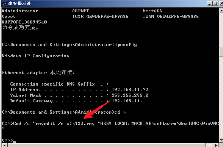 Cmd /c "regedit /e c:\123.reg "HKEY_LOCAL_MACHINE\software\RealVNC\WinVNC4" "