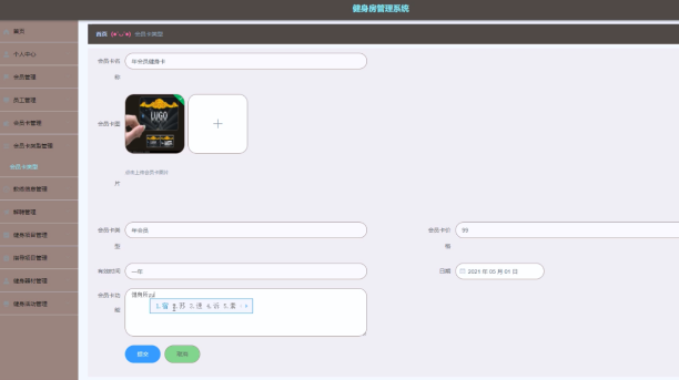 本健身房管理系统管理员,会员,员工。管理员功能有个人中心,会员管理,员工管理,会员卡管理,会员卡类型管理,教练信息管理,解聘管理,健身项目管理,指导项目管理,健身器材管理,健身活动管理。会员功能有个人中心,会员管理,会员卡管理,教练信息管理,健身项目管理,健身器材管理,健身活动管理。员工功能有个人中心,会员卡管理,教练信息管理,健身项目管理,健身器材管理,健身活动管理。因而具有一定的实用性。