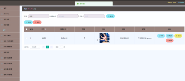 系统管理员可以查看对员工信息进行添加,修改,删除以及查询操作。具体界面如图所示。